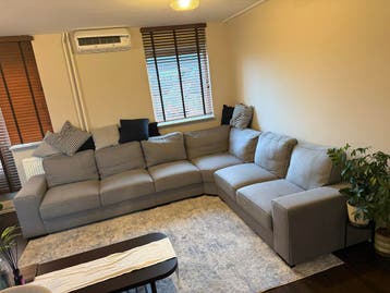Gratis af te halen: ruime hoekbank (280x350 cm). De bank heeft hier en daar lichte gebruikerssporen, maar is recent professioneel gereinigd en ziet er daardoor weer fris uit. Ideaal voor wie op zoek i