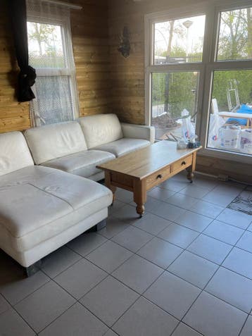 Gratis af te halen: comfortabele witte lederen hoekbank in l-vorm. De bank is gebruikt en vertoont de normale gebruikssporen, maar kan zeker nog een ronde mee. Geen scheurtjes of iets dergelijks, maar