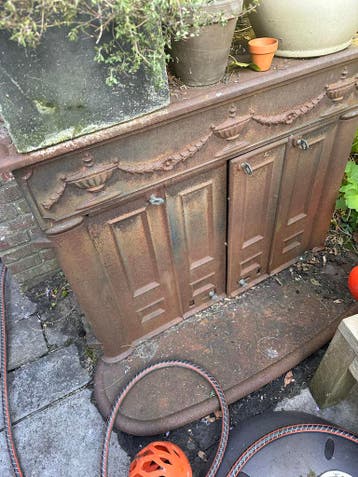 Uniek antiek gietijzeren object, oude kachel of fornuis, dat perfect dienst kan doen als decoratief element in uw tuin of als basis voor een buitenkeuken. L. Het object is zwaar en dient opgehaald te