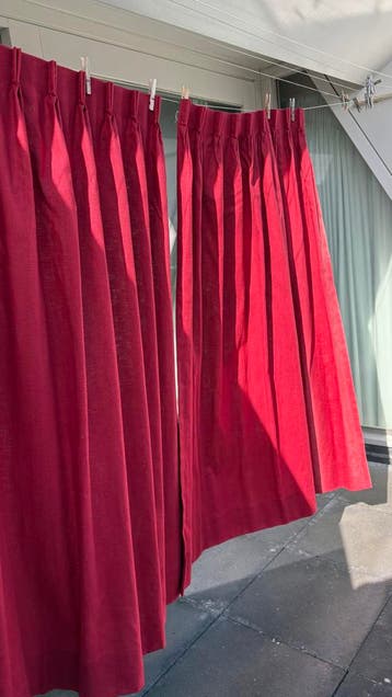 Set van roodkleurige linnen gordijnen, elk voorzien van 8 dubbele plooien. De gordijnen hebben een breedte van circa 68 cm en een hoogte van ongeveer 1,48 m. Door invloed van de zon is aan één zijde v