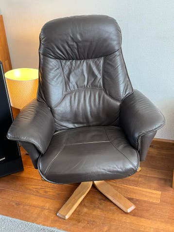 Comfortabele leren draaistoel in een donkerbruine kleur.