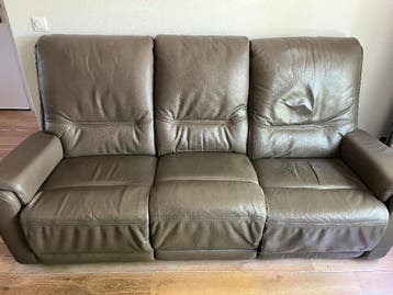 Gebruikte echt lederen 3-zits bank met aan de linkerkant een handmatig bedienbare relaxfunctie (3e foto) bank heeft gebruikersporen. Breed 220cm gratis af te halen van 5 mei tot 9 mei