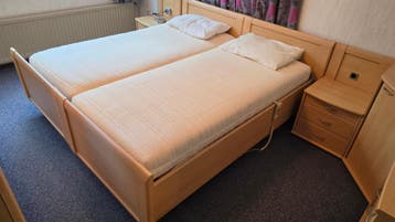 Gratis af te halen maar wel zelf uit elkaar halen. Slaapkamermeubel met 2 nachtkastjes, hoekkast, ladenkast, hang/legkast en spiegel. Elektrisch bedienbare lattenbodems. Matrassen (pullman) wil ik eig