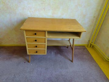 Mid-century bureautje in redelijke staat. Wel wat verfspatten. Lijkt niet van een bekend merk. 96,2 Cm breed 54,5 cm diep 76 cm hoog