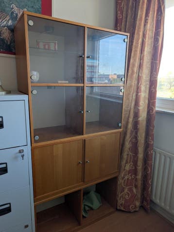 Mooie houten vitrinekast met glazen deuren in het bovenste gedeelte, ideaal voor het tentoonstellen van uw favoriete items. Het onderste gedeelte is voorzien van dichte houten deuren, wat extra opberg