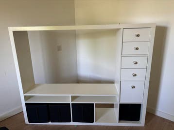 Gratis af te halen: een wit tv-meubel met handige lades en opbergbakken. Ideaal voor het opbergen van al je media-apparatuur en accessoires. Het meubel is gebruikt en heeft lichte gebruikssporen, maar