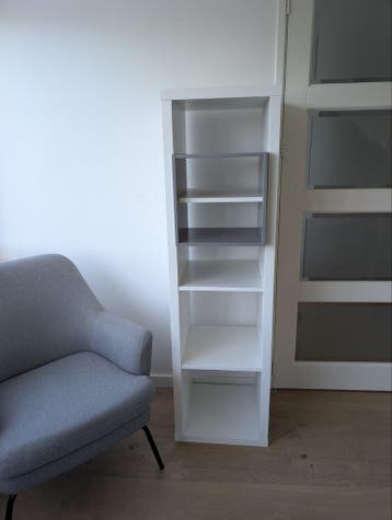 Mooie witte kallax vakkenkast van ikea met 4 vakken (4x1). Inclusief een grijze inzet met twee planken, ideaal voor extra opbergruimte of decoratie. De kast is gebruikt en er hebben wieltjes onder gez