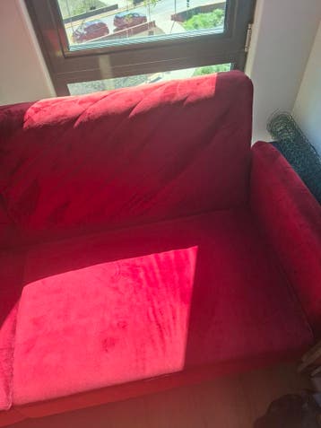 Deze rode fluwelen bank is een comfortabele en stijlvolle toevoeging aan elk interieur. De bank is vrijwel niet gebruikt en oogt nog in goede staat. Het fluwelen materiaal voelt zacht aan en geeft een