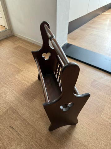 Een sierlijk houten tijdschriftenrek in donkerbruine uitvoering. Het rek heeft een klassiek design met gedraaide spijlen, kloverbladmotief uitgesneden in de zijpanelen en een elegante gebogen vorm. Ee