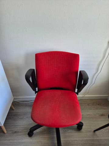 Comfortabele rode bureaustoel aangeboden. De stoel heeft wat gebruikerssporen, maar alle afstellingen functioneren nog perfect. De stoel is op te halen in de week van 4 mei.