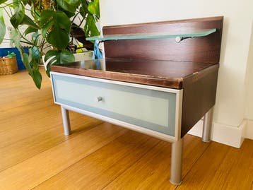 Gratis af te halen 2 nachtkastjes, als set, van hout, met een lade en een melkglas planchet. Kunnen desgewenst een verfje gebruiken (zie foto’s), maar kunnen nog goed een tijd mee. Afmetingen: (b x d