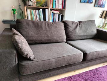 Bank, 3 à 4-zits chocoladebruin, stof gemêleerd afmetingen: breed: 235 cm diep: 100 cm hoog: ca 70 cm (leuning) hoogte zitting: 40 cm is gebruikt maar zit nog goed. Heeft losse kussens met hoezen (afn