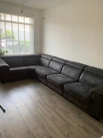 Comfortabele en ruime donkergrijze hoekbank, ideaal voor een grote woonkamer. De bank biedt veel zitruimte en is perfect om op te ontspannen. Let op: de bank is gebruikt en heeft zichtbare slijtage aa