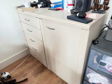 Praktische ladekast met vijf ruime laden en een extra opbergvak met deur. Ideaal voor het opbergen van kleding, documenten of andere spullen. De kast is uitgevoerd in een lichte houtkleur en heeft zil
