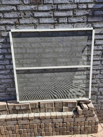 Raamhor breed 960 en hoog 900. Metalen profiel. Kan ook kwartslag worden gedraaid. Kleine beschadiging in horrengaas.