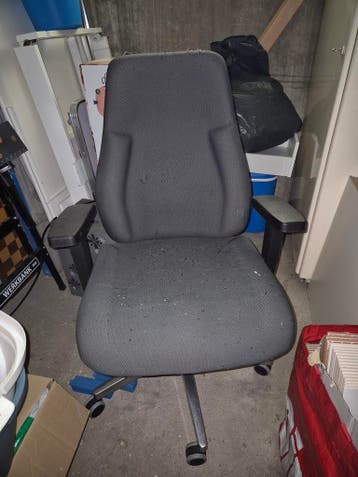 Bureaustoel. Zit fijn, maar zoals je ziet vonden de katten dat ook ;) met een hoes, kussen of kleed is het nog een prima stoel (of je moet het geduld hebben om al die halen met een naald terug te stek
