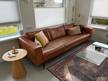 Deze ruime 4-zitsbank (nieuwwaarde > €3.000) Is 6 jaar oud. Zoals op de foto’s is te zien, zijn er diverse beschadigingen en krasjes in het leer op de zitting en armleuningen. Met de juiste le