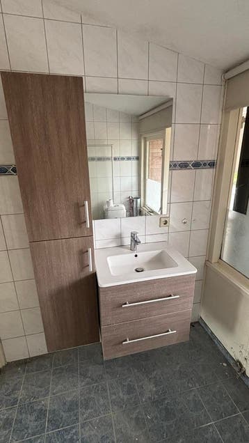 Complete badkamermeubelset bestaande uit een wastafelkast met twee lades, een bijpassende wasbak met spiegel en een hoge kast met twee deuren. Gratis af te halen ivm over, zelf demonteren datum in ove