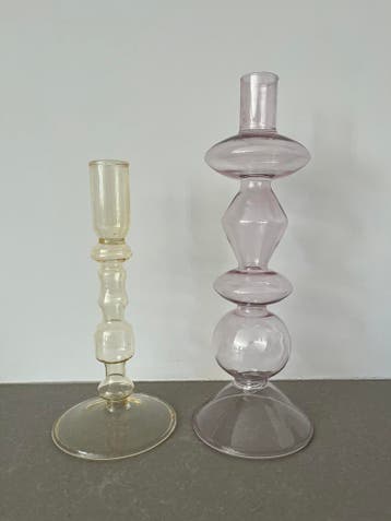 Mooie ranke glazen kandelaars in roze en geel. Hoogte 19 en 24 cm. Alleen ophalen.