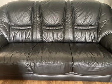 Mooi zwart lederen bankstel bestaande uit een comfortabele 3-zitsbank en twee bijpassende fauteuils. Ideaal voor een gezellige woonkamer. Het leer is gebruikt, maar nog in goede staat met de normale g