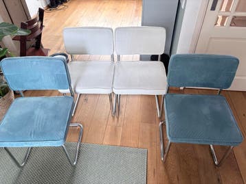 Gratis af te halen: 4 stoelen met bekleding. De stoelen zijn gebruikt en hebben wat vlekken in de bekleding. Ideaal voor wie handig is en de bekleding kan reinigen of vervangen, of voor gebruik in een