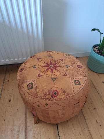 Gratis leren poef is langs de rand versleten dus heeft hier en daar een nieuw lapje nodig