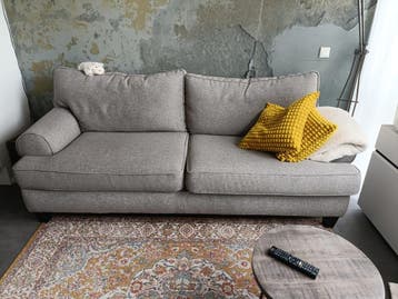Deze bank is te groot voor mijn woning, daarom doe ik 'm weg. Zit heerlijk (en slaapt nog beter 😉). Zonder vlekken! Losse kussens zodat je alles gemakkelijk schoon kunt maken. Kleur is gemêleerd