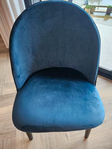 Mooie blauwe stoel met zwarte poten. De stoel is in goede staat en perfect voor in de woonkamer, eetkamer of slaapkamer. Comfortabel en stijlvol.