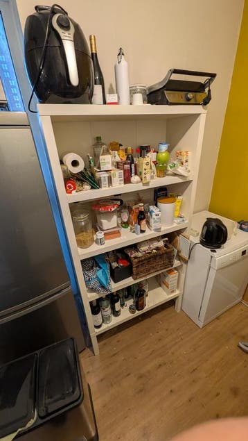 Witte voorraadkast gratis af te halen. De kast heeft wat verfvlekken en is niet in perfecte staat, maar functioneert nog prima. Ideaal voor extra opbergruimte in de keuken, bijkeuken of garage. Let op