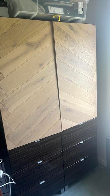 Besta boekenkast. Het bovenste stuk is open / eventueel te sluiten met zelfgemaakte houten deuren. Het onderste deel bestaat uit 2x3 lades. Veel bergruimte. Kast is donkerbruin. Twee losse delen. Gaat