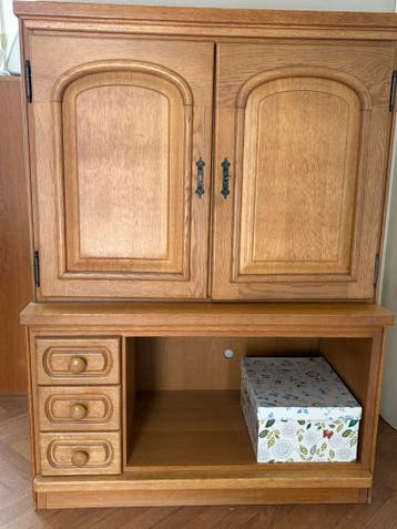 Mooie massief houten kast van licht eikenhout. De kast heeft twee deuren aan de bovenzijde en drie lades aan de linkeronderzijde, met daarnaast een open vak. Ideaal voor opslag of als televisiemeubel.