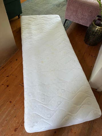 Comfortabel eenpersoons matras, ideaal voor een logeerbed of als extra matras. Het matras is gebruikt en heeft enkele lichte vlekken, maar is verder in goede staat, de tijk kan eraf en worden gewassen