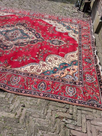 Tapijt, gratis. Afmetingen ruim 4 meter bij 3meter. Tapijt heeft her en der beschadigingen dus voor kamergebruik wat minder geschikt, doch wel voor andere toepassingen nog goed te gebruiken.