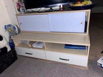 Deze veelzijdige tv-kast is ideaal voor elke woonkamer. Het meubel biedt voldoende ruimte voor uw televisie en beschikt over handige opbergmogelijkheden, waaronder schuifdeuren en lades, om al uw medi