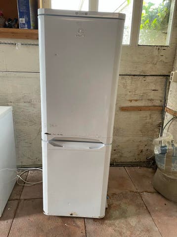 Gratis af te halen: een gebruikte indesit koelvriescombinatie. De koelkast is nog functioneel, maar heeft wel wat gebruikerssporen en lichte roestvorming aan de onderkant, zoals te zien op de foto'