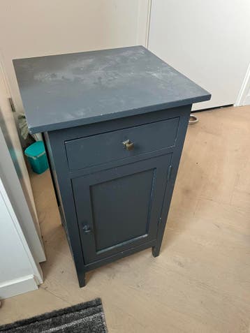 Gratis af te halen: een gebruikt nachtkastje in donkergrijze blauwe kleur. Het kastje heeft een lade en een deurtje met opbergruimte erachter. Ideaal voor naast het bed of als extra opbergmeubel. Het