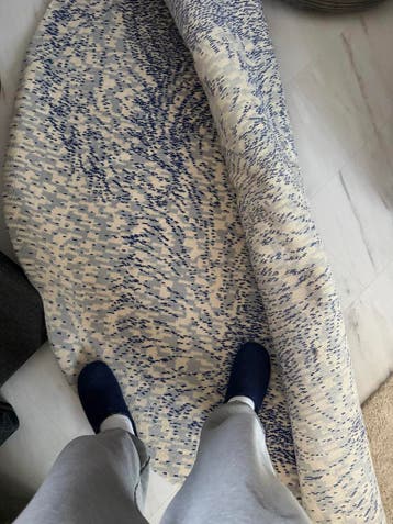 Mooi tapijt met een modern geometrisch patroon in blauw en wit. Ideaal voor de woonkamer of slaapkamer. Het tapijt is in goede staat en kan direct gebruikt worden om uw interieur op te frissen.
