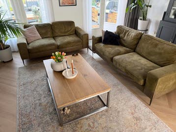 Deze prachtige 3 + 2 zitsbank in een stijlvolle groene kleur micro leer is zo goed als nieuw en biedt optimaal zitcomfort. Beschikbaar vanaf 18 mei de bank past perfect in een modern of klassiek inter