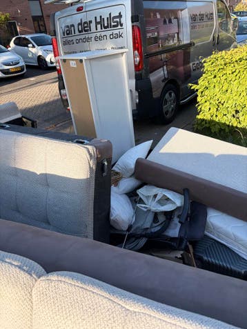 Dit bankstel wordt gratis aangeboden. Het is een rechte bank die plaats biedt aan twee tot drie personen. De bank is gebruikt en vertoont duidelijke gebruikssporen, zoals te zien op de foto's. Ide