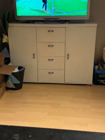 Praktische witte tv-kast met twee deuren en vier ruime lades in het midden. Ideaal voor het opbergen van media-apparatuur, dvd's, games en andere spullen. De kast is gebruikt en heeft lichte gebru