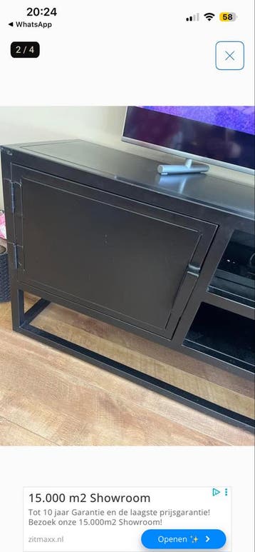 Mooi stalen televisiemeubel van gigameubel in het zwart. Het meubel is voorzien van twee dichte kastjes en twee open vakken, ideaal voor al je apparatuur. Er zijn lichte krassen op de bovenkant aanwez