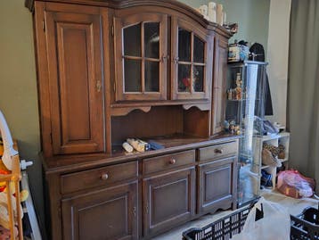 Mooie bruine houten kast, ideaal voor de woonkamer of eetkamer. De kast heeft een vitrinegedeelte met glazen deuren, perfect om uw mooiste spullen in tentoon te stellen. Daaronder bevinden zich handig