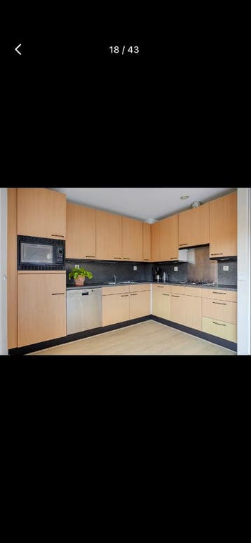 Deze complete hoekkeuken is in goede staat en voorzien van diverse inbouwapparatuur, waaronder een magnetron, vaatwasser en kookplaat. De keuken heeft een lichte houtkleur en een donker werkblad, wat