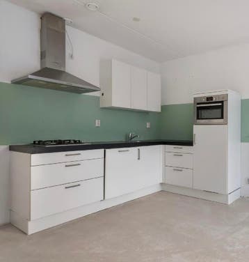Te koop: complete moderne hoekkeuken. De keuken is voorzien van een gaskookplaat, afzuigkap, oven en spoelbak met kraan. De koper dient de keuken zelf te demonteren en op te halen. Beschikbaar voor op