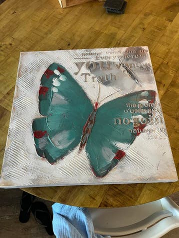 Schilderij in goede staat. Afmetingen 60x60x5 cm prachtig schilderij met een opvallende vlinder in groen- en roodtinten, voorzien van een uniek 3d-effect. De achtergrond is wit met een gestructureerd