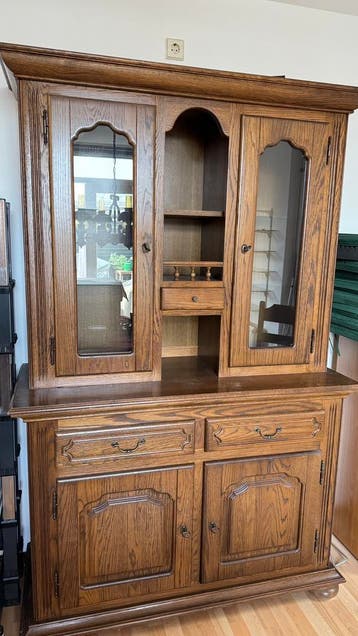 Mooie eikenhouten buffetkast. Maat: hoogte 208 cm, breedte 132 cm, diepte onderste buffet 55 cm, diepte bovenste buffet 38 cm op te halen in wassenaar