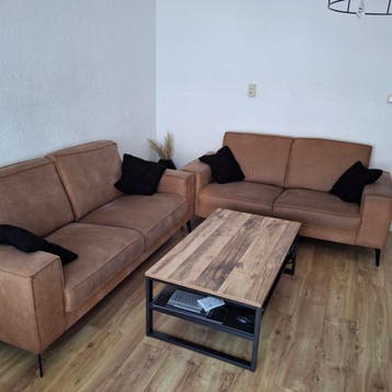 Mooie set van twee comfortabele banken in een warme bruine kleur. De set bestaat uit een 2-zitsbank en een 3-zitsbank, perfect voor een gezellige woonkamer. Ze zijn gemaakt van een zachte stof die aan