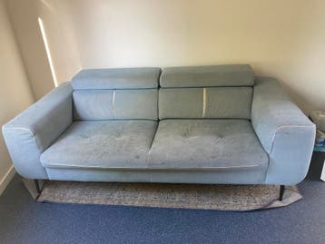 De bank is niet meer in zijn beste staat qua bekleding. Qua stevigheid is hij echter nog prima. Misschien kan er zo'n doek overheen en kan hij weer even mee. Rugleuningen kunnen eventueel omhoog.