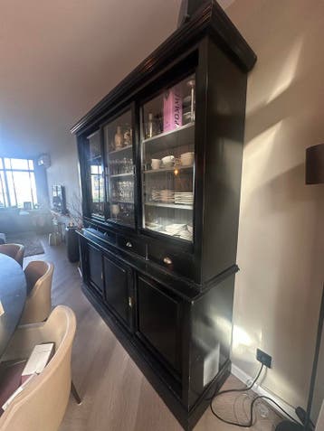 Wegens verhuizing. Prachtige zwarte houten vitrinekast met glazen schuifdeuren in het bovengedeelte en dichte deuren en lades in het onderste gedeelte. Ideaal voor het opbergen en tentoonstellen van s