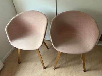 Set 2 stoelen hay about a chair. Stof heeft vlekjes met schoonmaken te verwijderen. 1 Stoel twee hele kleine gaatjes. Onderstel nog heel goed. Nog prima te gebruiken. Gratis ophalen.